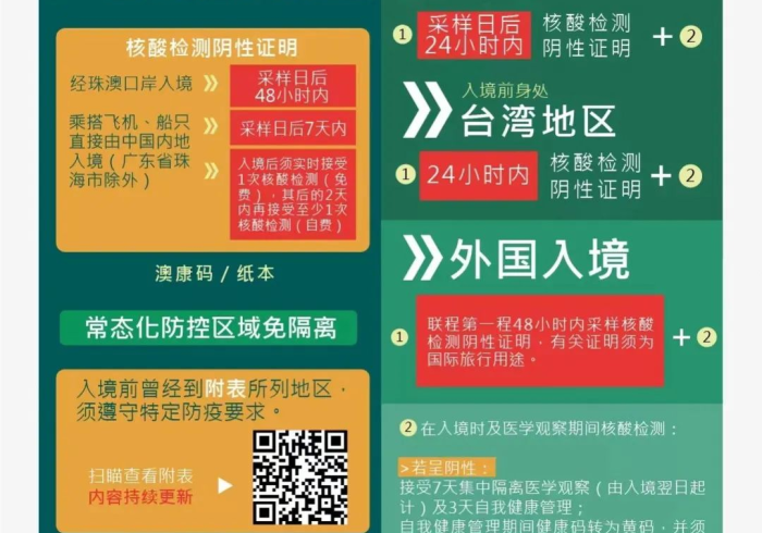 对于来自“高风险”地区的人士,入境后需接受“14天集中隔离医学观察+7天自我健康管理”;“中风险”地区人士需进行“14天指定地点(家居)医学观察+7天自我健康管理”;而“低风险”地区人士(通常指过去14天内未到过中高风险地区)在持有规定时限内的核酸检测阴性证明,并出示绿色澳门健康码后,可免于隔离,但入境后需进行多次核酸检测。